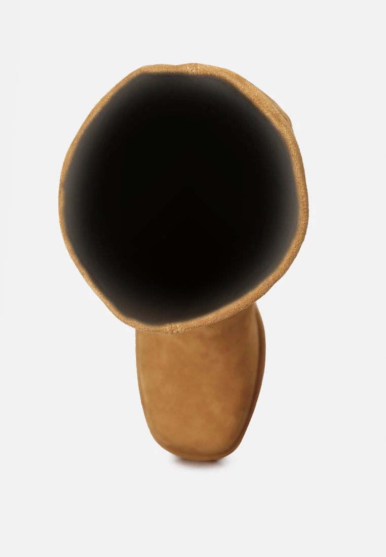 Made from super stretch fine suede, this one fits along the feet curve so well, looks just made for it! Built on raised platform, this pair of block heeled square cut toe calf boot has supreme aesthetics and utilitarian value. Comes with side zipper opening whih makes it easy to wear.