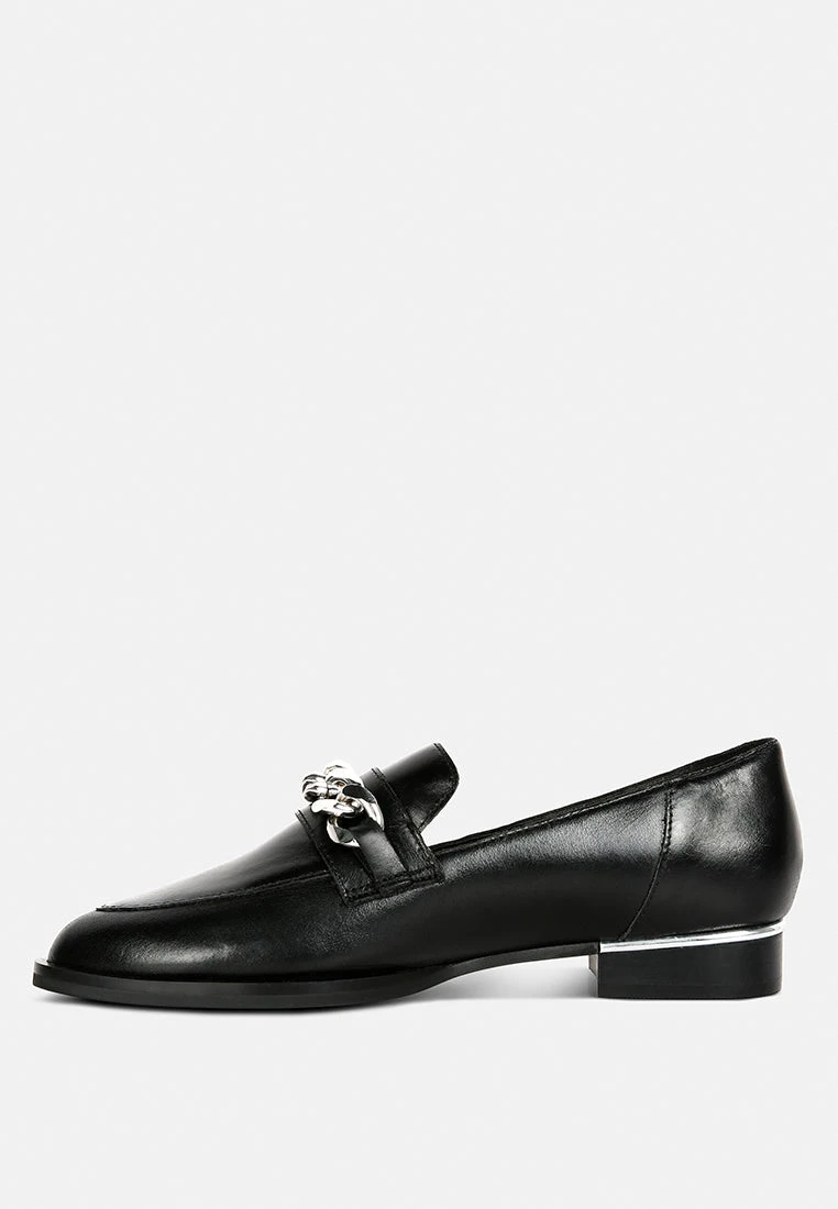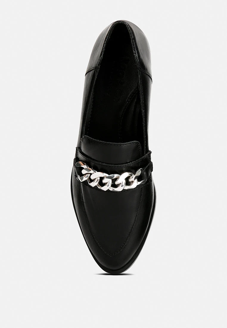 Black Semi Casual Leather Slip-on Loafers with Metallic Chain Detail: looks good and feels good with style and comfort guaranteed. Shine from top to bottom and be prepared for the day ahead with this. You are ready to hit the high street with these in your closet.
