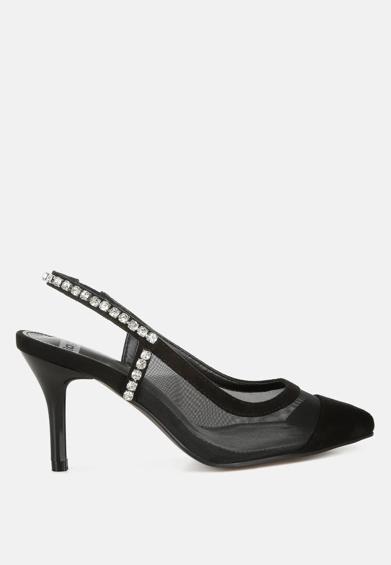 Chic and glamorous, the slingback sandals have a charming allure with the beautiful diamante embellished slingback detail. The mesh and microfiber upper is of high quality and exhibits a kind of stylish sophistication which gives them an irresistible factor.Â